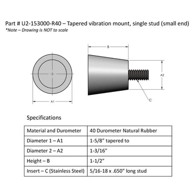 Rubber Isolators Mount - L8-003004-P40 - Male/Female (C) 5/16-18 x 5/8" long stud (one end) and open-ended 5/16-18 female (A) Diameter: 1" (B) Hei...