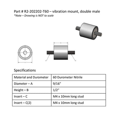 Isolation Mount - R2-202202-T60 - 2 Studed (C) M4 x 10mm long stud (both ends) (A) Diameter: 9/16" (B) Height: 1/2" Material: Nitrile Durometer: 60