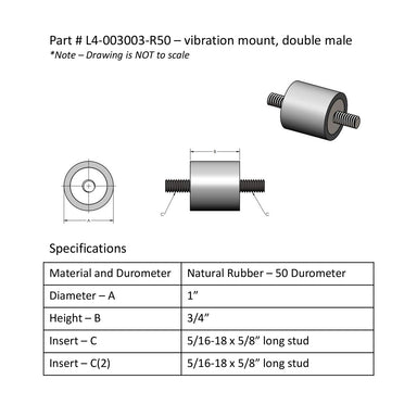 Rubber Vibration Mount - L3-017033-R70 - 2 Studed (C) 5/16-18 x 1/2" long stud and 5/16-18 x 3/4" long stud (A) Diameter: 1" (B) Height: 1/2" Mate...