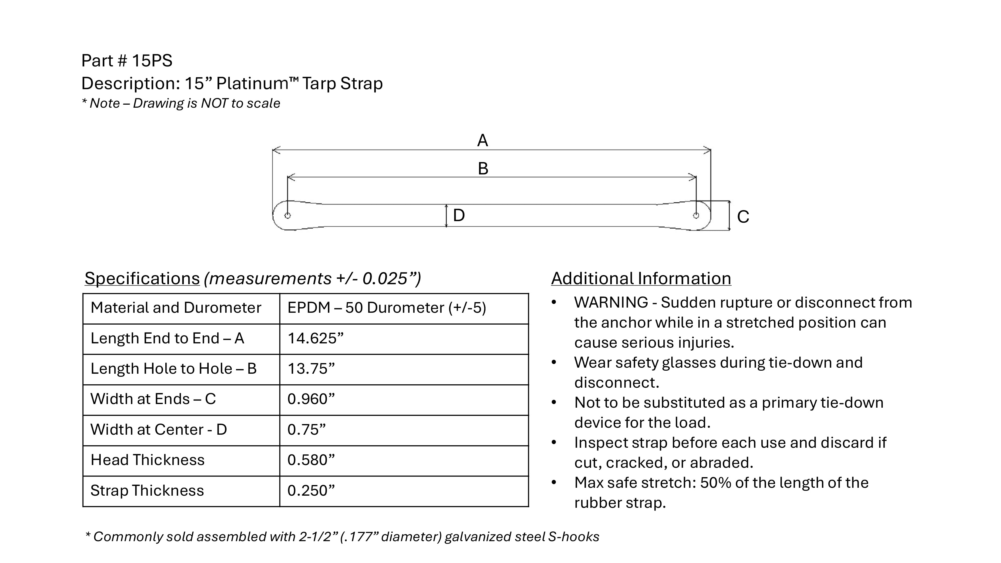 WARNING - Sudden rupture or disconnect from the anchor while in a stretched position can cause serious injuries. Wear safety glasses during tie-down and disconnect. Not to be substituted as a primary tie-down device for the load. Inspect strap before each use and discard if cut, cracked, or abraided. Max safe stretch: 50% of the length of the rubber strap.